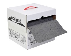 spillpod? General Purpose absorbent roll in convenient dispenser box. Perforated bi-laterally for easy tearing and maximum economy. Can be used to quickly deploy continuous lengths of absorbent material or divided into individual sheets.