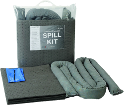 The kit includes absorbent socks to contain spills and protect drains and absorbent pads to soak up spilled liquids. Disposal bag and zip-tie included. Instructions for use clearly displayed on exterior label.