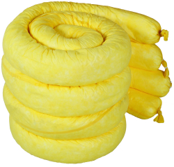 Chemical absorbent booms. Safely absorb acids, alkalis and strong chemicals for easy clean-up of hazardous spills and leaks. Place at the base of leaking machinery to absorb leaks on contact and reduce the spread of contamination. Use to surround a spillage to prevent further spreading and absorb on contact, or around pallets to contain and absorb leaks from damaged drums.