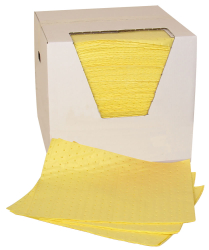 200 Single-weight chemical absorbent pads. Safely absorb acids, alkalis and strong chemicals for easy clean-up of hazardous spills and leaks. Tough, hard-wearing finish for use in industrial applications. Central perforation for easy tearing and maximum economy. Ideal for bench-top use.