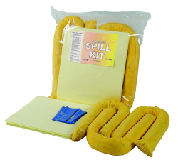 The kit includes absorbent socks to contain spills and protect drains and absorbent pads to soak up spilled liquids. Disposal bag and zip-tie included. Instructions for use clearly displayed on exterior label.