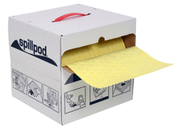 spillpod? Chemical absorbent roll in convenient dispenser box. Perforated bi-laterally for easy tearing and maximum economy. Can be used to quickly deploy continuous lengths of absorbent material or divided into individual sheets.