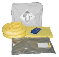 The kit includes absorbent socks to contain spills, a large clay Plug Rug draincover to protect drains and absorbent pads to soak up spilled liquids. Disposal bag and zip-tie included.