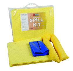 The kit includes absorbent socks to contain spills and protect drains and absorbent pads to soak up spilled liquids. Disposal bag and zip-tie included. Instructions for use clearly displayed on exterior label.