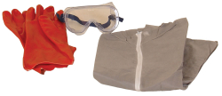 Personal Protection Equipment pack, contains protective goggles (AEGOG), red PVC protective gloves (AGPR) and a non-hazardous oversuit (AOVER).