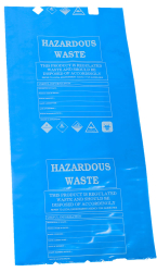 Pack of 100 Blue 50 micron disposal bags with zip ties. Printed with ?HAZARDOUS WASTE? to assist accurate waste disposal.