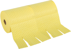 Premium-weight chemical absorbent roll. Safely absorbs acids, alkalis and strong chemicals for easy clean-up of hazardous spills and leaks. Easily covers large areas to clean up spills and leaks quickly and cleanly. Tough and hard-wearing finish for use in industrial applications. Perforated across width and along length for easy tearing and maximum economy.